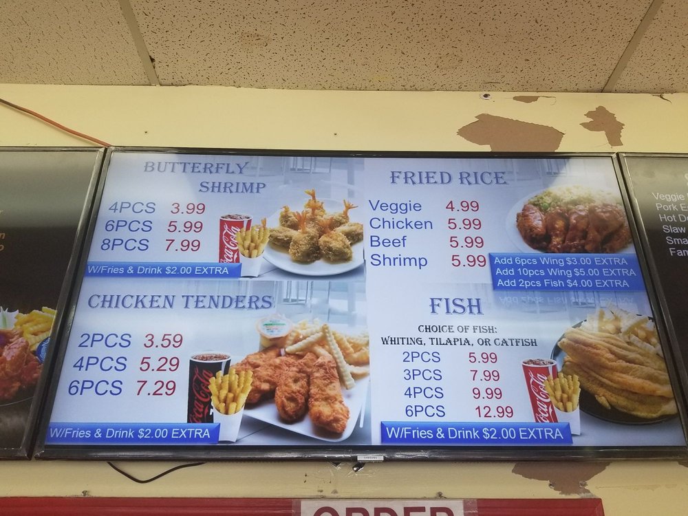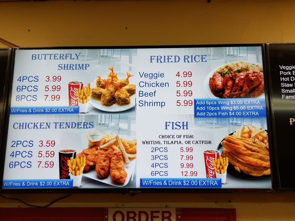 Choice of fish whiting, tilapia, catfish.