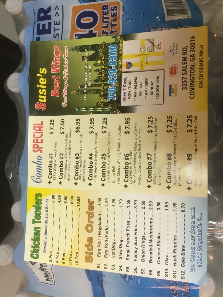Welcome to Susie’s Best Wings, your ultimate destination for chicken wing aficionados! Located at 3257 Salem Rd, Covington, GA, this lively eatery offers a divey atmosphere with outdoor seating and dog-friendly options, making it perfect for families and groups alike. The menu caters to every craving, featuring mouthwatering selections from classic chicken wings to tasty combinations like the Chicken Philly Combo and crispy chicken tenders.